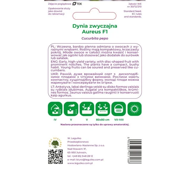 Patison Aureus F1 to wczesna, bardzo plenna odmiana dyni zwyczajnej o charakterystycznych, żółtych owocach z wyraźnymi wrębami. Rośliny mają kompaktowy, krzaczasty pokrój, co ułatwia uprawę w ogrodach przydomowych. Młode owoce można konserwować, kwasić lub dodawać do surówek i sałatek. Większe patisony świetnie nadają się do nadziewania, smażenia lub przygotowania placków.