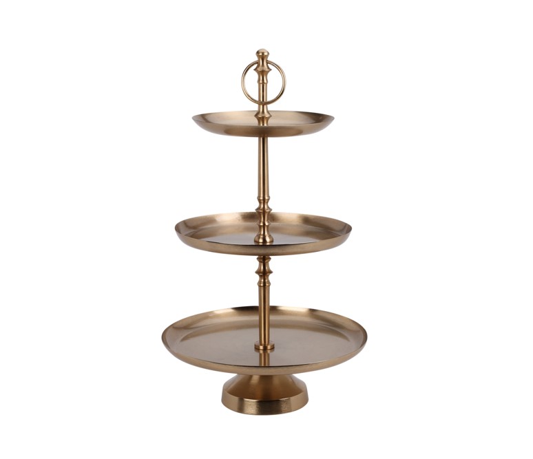 Złota etażerka charakteryzuje się eleganckim i nowoczesnym designem. Jej połyskująca powierzchnia dodaje blasku i luksusu, sprawiając, że stanie się centralnym punktem każdej aranżacji. Można ją wykorzystać do serwowania przekąsek, deserów, owoców czy wypieków, a także jako dekoracyjny element stołu, który przyciąga wzrok gości.