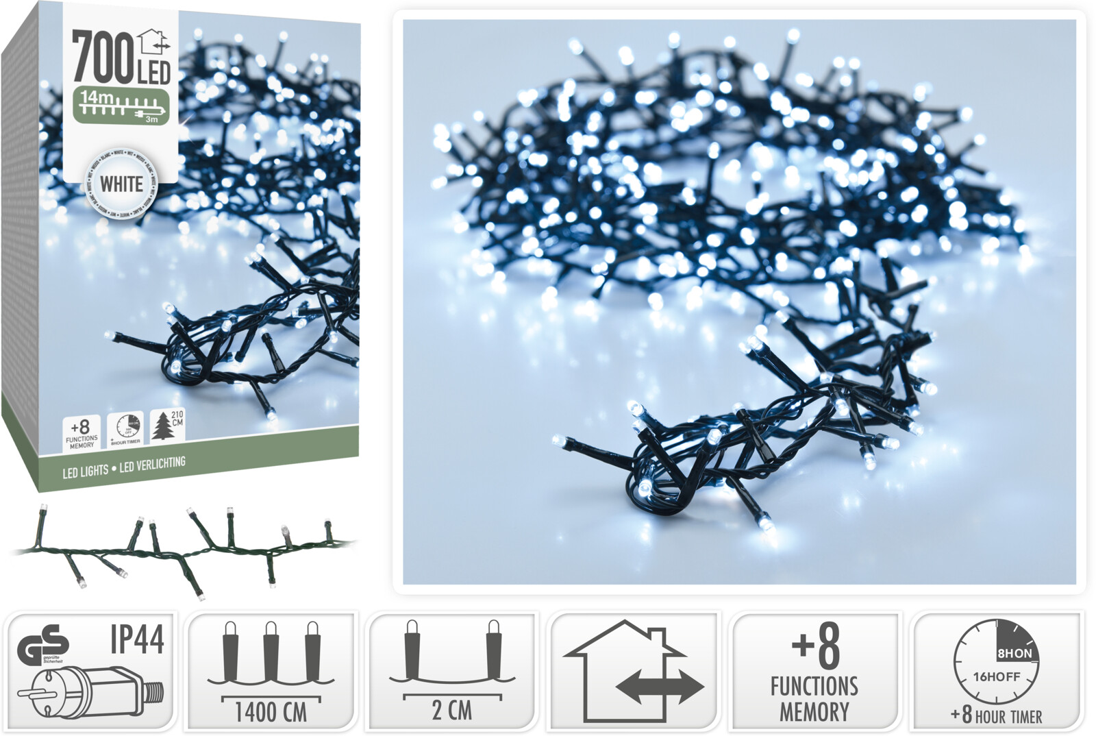 Nadaj swojej dekoracji wyjątkowego charakteru dzięki lampkom LED 700 diod w eleganckim zimnym białym kolorze. Długi łańcuch świetlny (14 m) idealnie sprawdzi się do ozdobienia choinki, balustrad, okien czy ogrodu. Różnorodne tryby świecenia i praktyczny timer pozwolą stworzyć nowoczesną iluminację bez wysiłku.