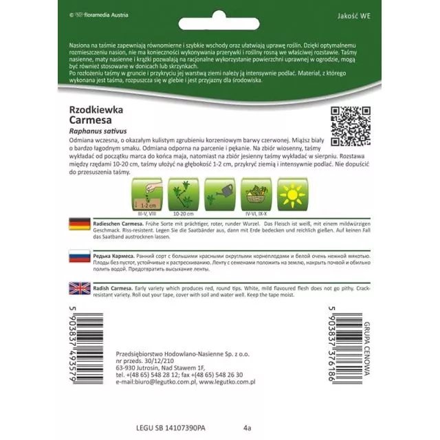 Odmiana wczesna, plenna, o dużych, kulistych zgrubieniach w intensywnie czerwonym kolorze. Miąższ biały, chrupiący, o łagodnym smaku – idealna na kanapki, do sałatek i jako zdrowa przekąska. Odporna na parcenie i pękanie, dzięki czemu dłużej zachowuje świeżość i chrupkość! 🌱