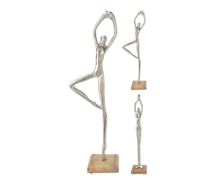 Metalowa statuetka na drewnianej podstawie – nowoczesna ozdoba do wnętrz 48 cm srebrna