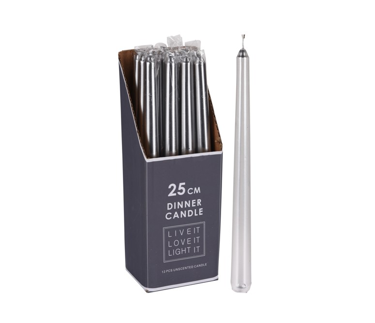 Świeca obiadowa srebrna o wysokości 25 cm to stylowy i elegancki dodatek, który świetnie sprawdza się podczas uroczystych kolacji i wyjątkowych okazji. Jej srebrny kolor wprowadza chłodny, metaliczny blask, dodając wnętrzu wyrafinowanego charakteru. Dzięki smukłej sylwetce i 25-centymetrowej wysokości, świeca ta doskonale pasuje do każdego nakrycia stołu, nie dominując nad pozostałymi elementami dekoracji, ale subtelnie podkreślając ich urok.