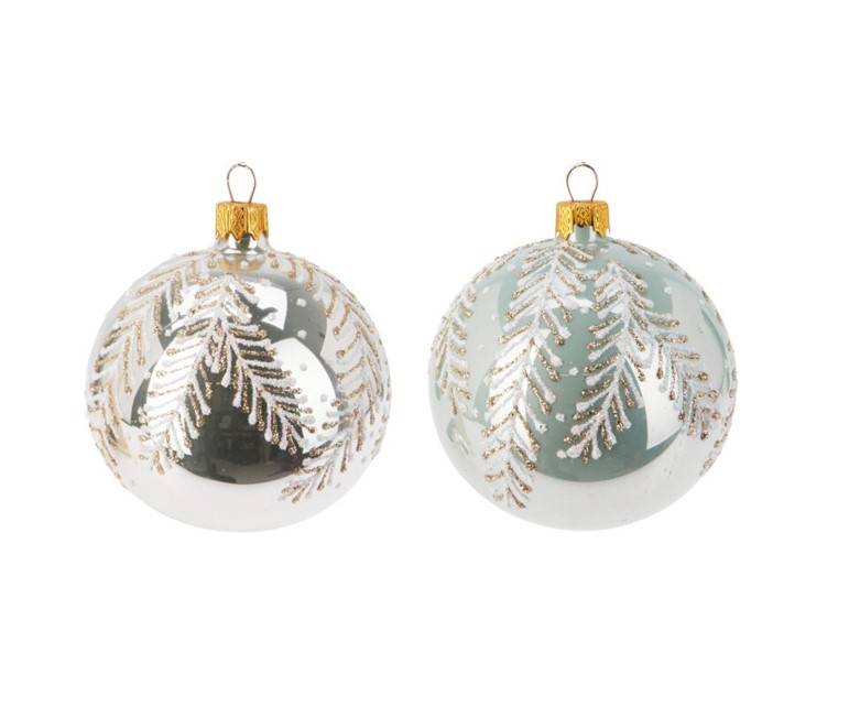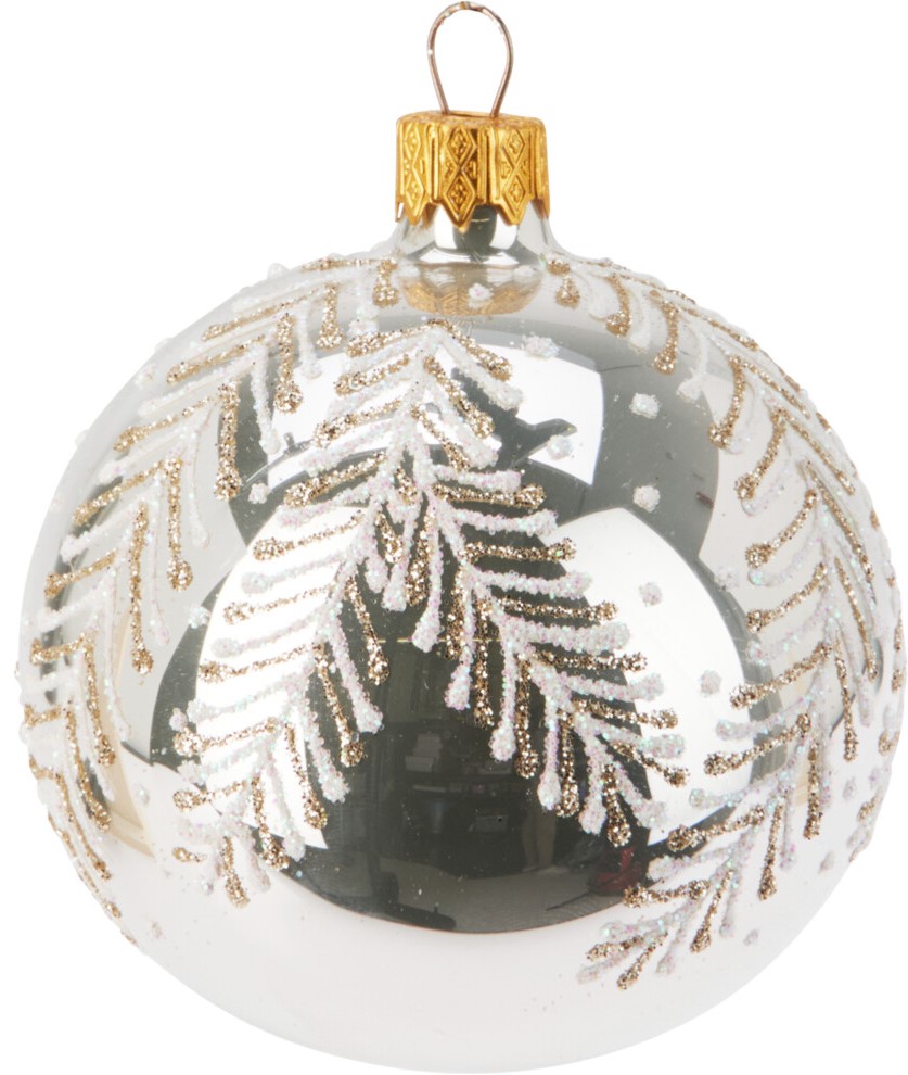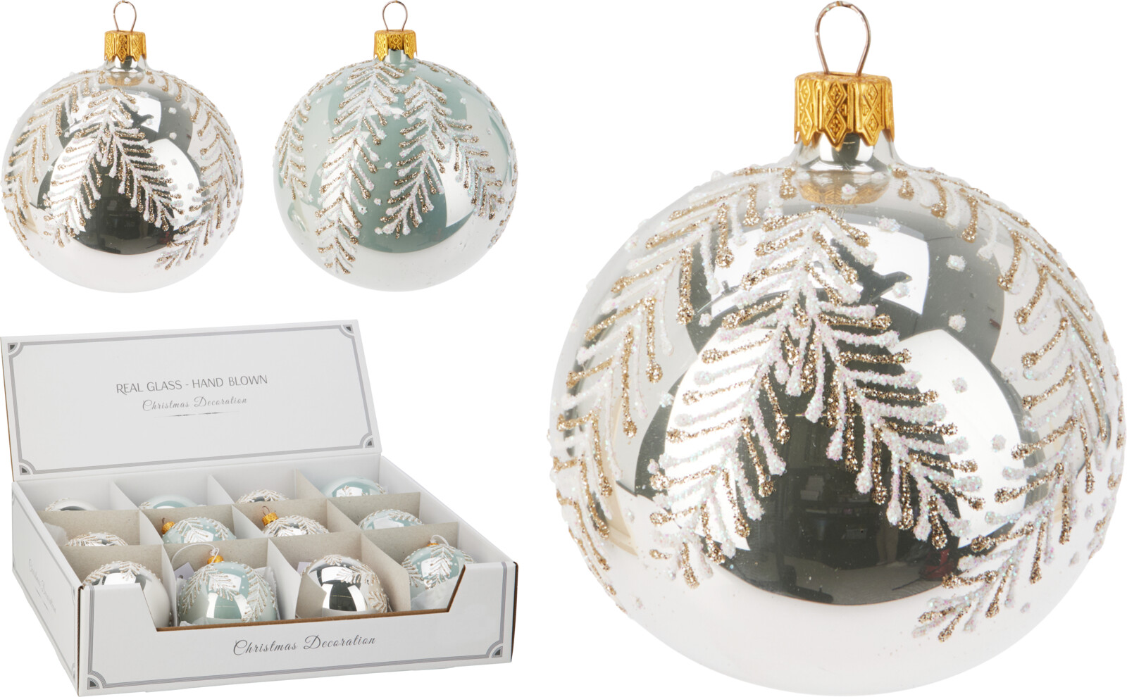 Elegancka szklana bombka choinkowa 80 mm w srebrnym kolorze to doskonały wybór do nowoczesnych i klasycznych aranżacji bożonarodzeniowych. Ozdobiona delikatnym zielonym akcentem oraz białym i miedzianym brokatem, pięknie odbija światło i podkreśla świąteczny klimat. Wyposażona w klasyczną srebrną czapeczkę.