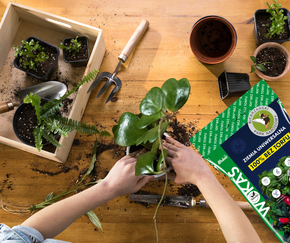 Skrzynki, doniczki i inne pojemniki do przesadzania roślin dokładnie wyczyścić. Na dno wsypać warstwę Ziemi uniwersalnej WOKAS NATURALNIE, ewentualnie poprzedzić wsypaniem drenażu. Lekko oczyszczone korzenie przesadzanych roślin rozłożyć i starannie umocować w nowym podłożu. Następnie dosypać odpowiednią do wielkości pojemnika ilość Ziemi uniwersalnej WOKAS NATURALNIE i obficie podlać.